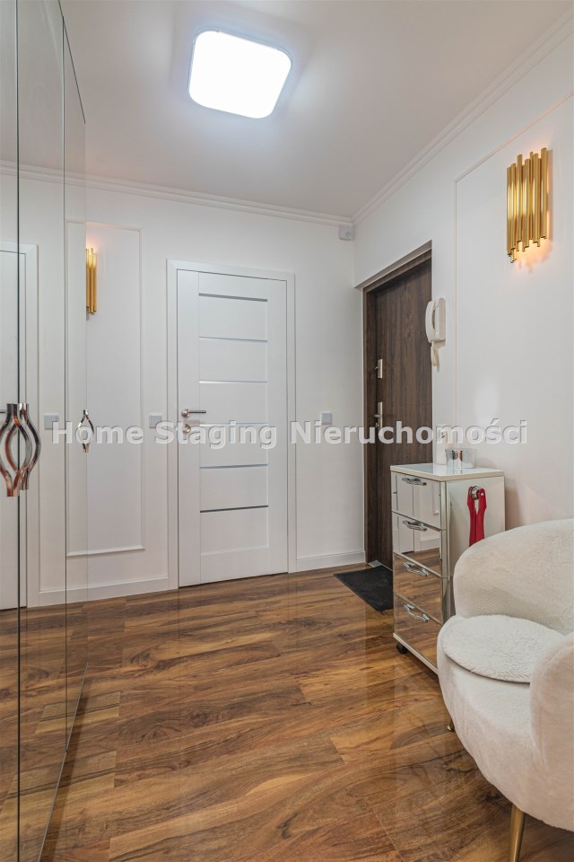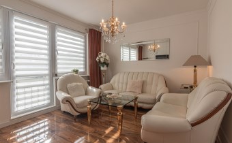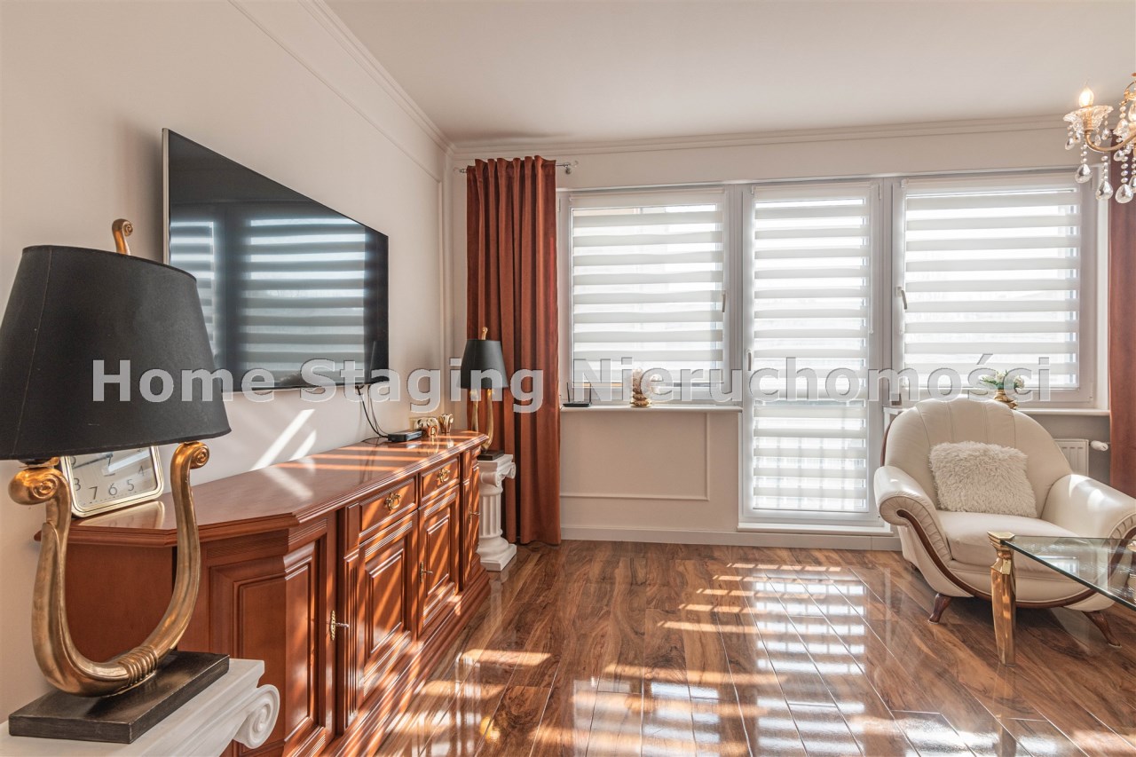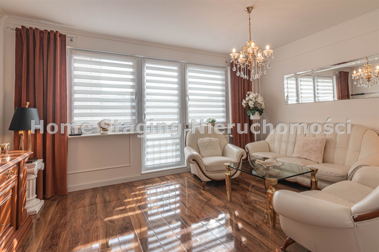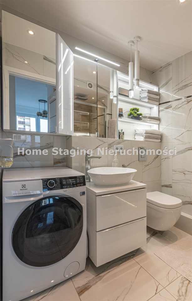 Mieszkanie kompletnie umeblowane i wyposażone; w dużym pokoju zestaw mebli skórzanych, komoda, odbiornik TV, w sypialni duże łóżko, szafa w zabudowie, odbiornik TV. Łazienka nowocześnie zaaranżowana z dużą kabiną prysznicową z krzesełkiem, wyposażona w pralkosuszarkę. W kuchni sprzęt AGD: lodówka z zamrażarką, płyta indukcyjna, piekarnik, okap, zmywarka. Dodatkowo zestaw sztućców, talerzy, garnków oraz innych urządzeń typu air-frayer, soda-strean, czajnik, itp. Mieszkanie wyposażone jest również w odkurzacz, suszarkę do ubrań, deskę do prasowania, żelazko, pościel oraz ręczniki.