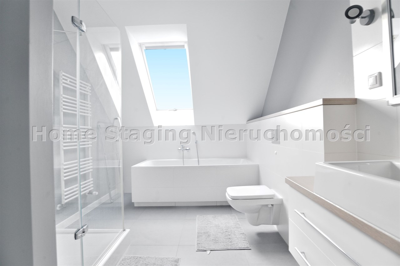 Na piętrze sypialnia oraz duża łazienka z wanną i kabiną prysznicową.