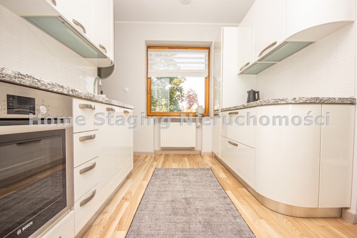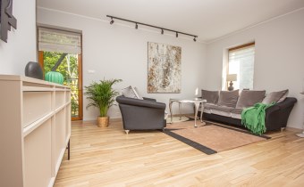 Zostało urządzone z najwyższej jakości materiałów z gustem i dbałością o detale – drewniane podłogi, wełniane dywany, kamień naturalny w kuchni i łazience, designerskie oświetlenie i dodatki.